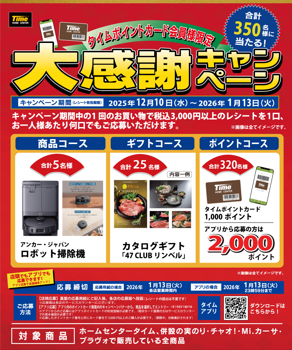 当選発表後、タイム店舗のサービスカウンターでの賞品お渡し・ポイント付与になります。アプリでポイントコースへ応募の方は自動的にポイント付与されます。